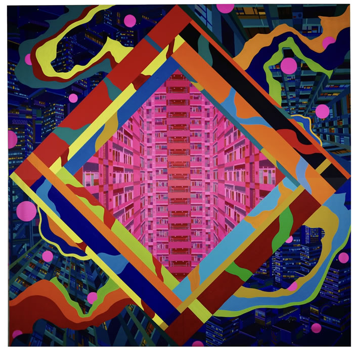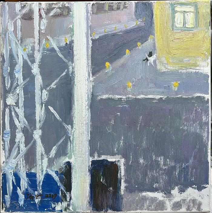 張虹,《防盜欄.散步的鄰居》,2019,布面油畫,40cmx40