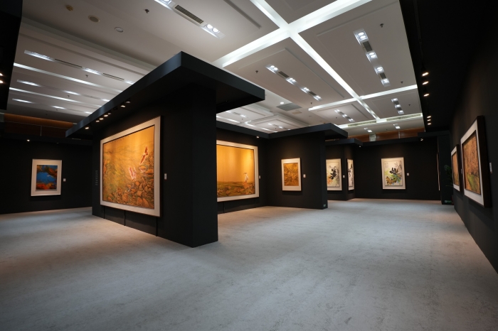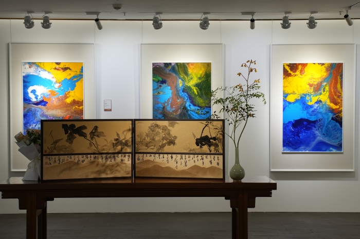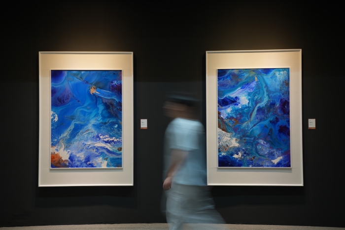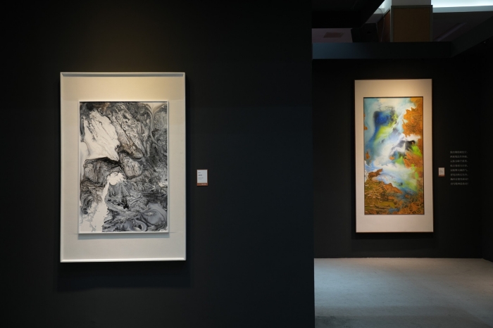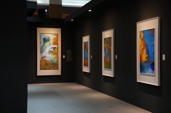 走進展廳,中國傳統繪畫的古典味道融匯著現代生活的審美氣息撲面而來。本次展覽共展出76幅作品,飽含新宋式系列、宇宙系列、荷花系列、屏風系列、書法系列五個系列。其中“新宋式系列”代表作《流金旋舞》《云扶玉嶂》意境悠遠,渾然天成。此次展出了藝術家精心創作的十幅震撼人心的潑彩山水。