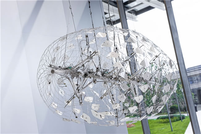 趙瀟瀟,《云圖》,2022,鋁、電子元件、碳纖維桿。晉城“古建新語”當代藝術展——“斗轉星移”藝術家群展展覽現場,晉城城市體驗中心,2025。圖片由UCCA Lab提供