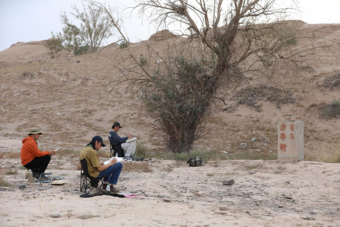 在黑水國遺址,藝術家們面對的是被戰爭、風沙與時間三重磨礪的文明碎片。斷壁殘垣與散落的漢磚陶片,訴說著昔日的繁華與最終的寂滅。陳琪對此感觸尤深,他回憶在夕陽余暉中,古城墻與毗鄰的玉米地構成蒼茫而鮮活的畫面,令他當場完成兩幅心儀之作。他感慨:“在此作畫如同與歷史對話”,并嘗試以當代水墨捕捉這種跨越時空的共鳴。這種“搶救性記錄”式的寫生,已超越了技法練習,升華為以畫筆挽留時光、為湮滅文明獻上的深沉詩篇。