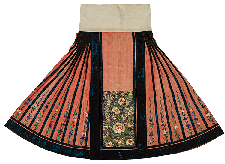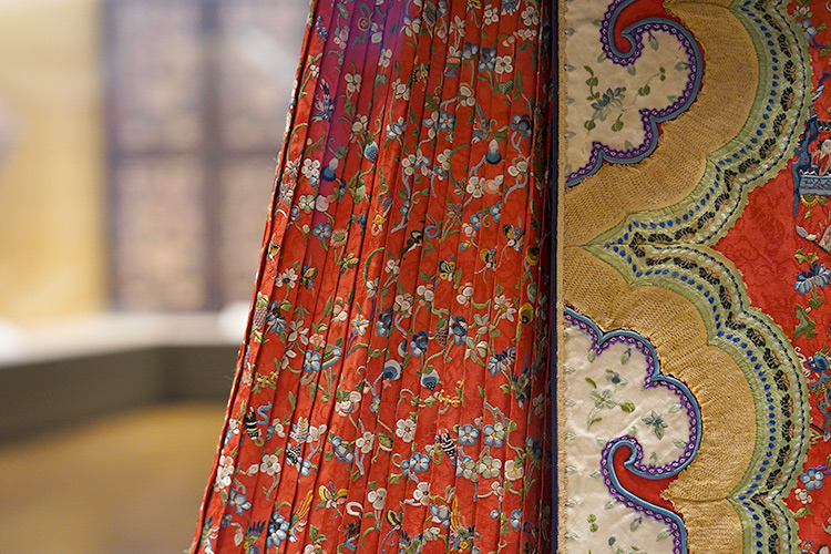 紅色提花綢刺繡花卉紋闌干馬面裙 二十世紀初長91厘米 寬177厘米 北京服裝學院民族服飾博物館藏
