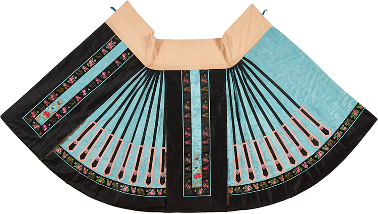 藍色暗花緞地繡花鳥紋夾棉闌干馬面裙 清 長118.2厘米 寬100.8厘米 北京服裝學院民族服飾博物館藏