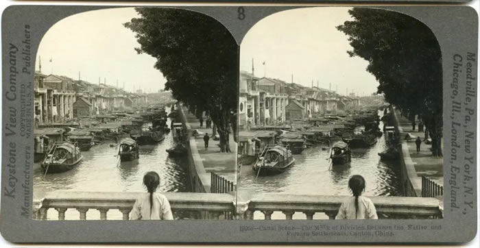 19世紀廣州沙面租界與老城之間的運河景象。這條人工運河是當時中西社區的分界線,一側是秩序井然的租界,另一側是舟船云集、人口密集的中國傳統城市空間