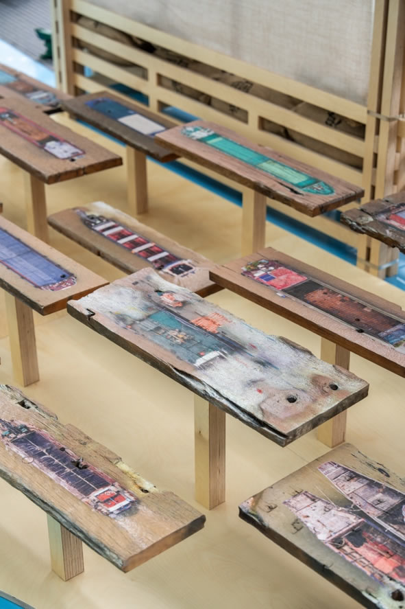 從河流中獲取的各種船的圖像,打印在老船木上,再放回河流中隨水漂流。圖像通過老船木重新獲得了現實空間中的漂流體驗。