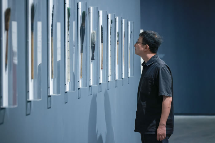 展覽特別展出了石虎先生自制的多種毛筆,這也令其深有感觸。傳統制筆講究“尖齊圓健”的實用標準,而石虎先生卻反其道而行——他追求“健”,卻突破“尖齊圓”的束縛,采用竹纖維、草纖維等硬質材料制筆,創造出豐富的線條效果。這種對工具的革新體現了他“回歸造筆之初”的理念:唯有改變工具,才能解放筆法,進而展現當代人對線條與空間的獨特理解。