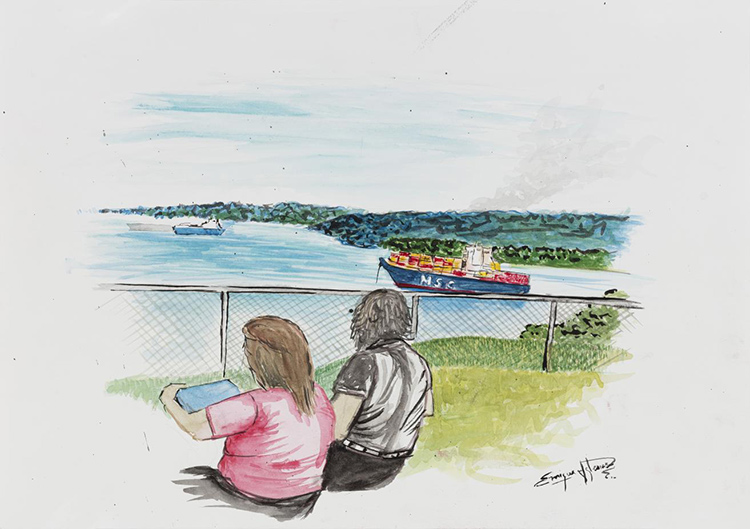 展覽現場,創作者為現場觀眾耐心細致地講解畫作背后的故事。參觀者悉心聆聽,不時拿出手機記錄畫作細節,遇到感興趣的內容還會主動與創作者交流——有觀眾好奇巴拿馬運河畫作中船閘的運作原理,創作者便結合當地地理特征與航運歷史細細解答;也有觀眾分享自己游覽揚州古運河的經歷,與創作者探討運河景觀在不同文化語境下的藝術表達,展廳內滿是跨文化交流的熱烈氛圍。