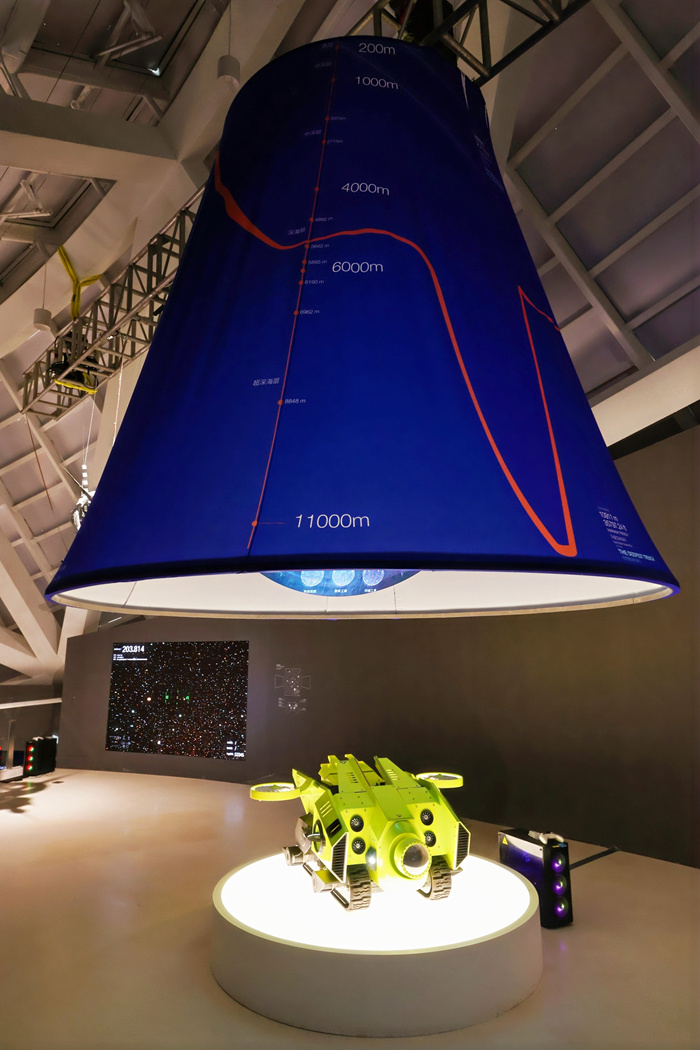 由中國美術學院創新設計學院計算藝術研究所與中國科學院創作的虛擬仿真交互裝置《深海智能無人潛航器》是一種集機動性、多功能與廣闊機動范圍于一體的深??茖W考察智能裝備能為深??瓶继峁﹫詫嵵?。展覽中呈現的是基于深海自主機器人工作平臺設計的多功能工作平臺概念方案,生動展現未來深??瓶脊ぷ鲌鼍?,向觀眾充分展現深??茖W的獨特魅力。由西湖大學自主研發的新一代深海潛水器《西谷I號深海仿生魚型潛水器模型》,以“水下具生智能”為核心架構,依托仿生學理論突破與前沿人工智能技術,憑借高機動性、高穩定性、高靈活性以及高靜謐性,成為深海探索領域的一項革命性創新。