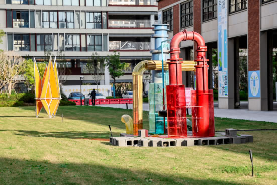 移步至懸吊空間左側草坪(C區),藝術從室內延展至自然之中。戶外裝置與綠地景觀相映成趣:《申城疊影》以折疊屏風造型隱喻城市的流動與生長;《風的漫游》與《管見之蕩·循環新生》在開闊空間中與觀眾形成互動;《浮光夢蝶》與《共襄美好》則營造出詩意與科技交融的視覺現場,邀請觀眾在漫步中邂逅藝術與自然的對話。