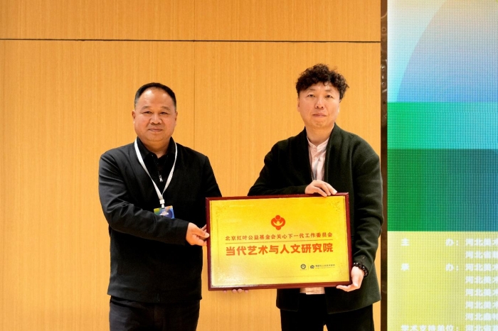 隨后,舉行了北京紅葉公益基金會關心下一代工作委員會當代藝術與人文研究院授牌儀式。中國關心下一代工作委員會教育中心原副主任、北京紅葉關工委主任黃殿龍為“當代藝術與人文研究院”授牌。
