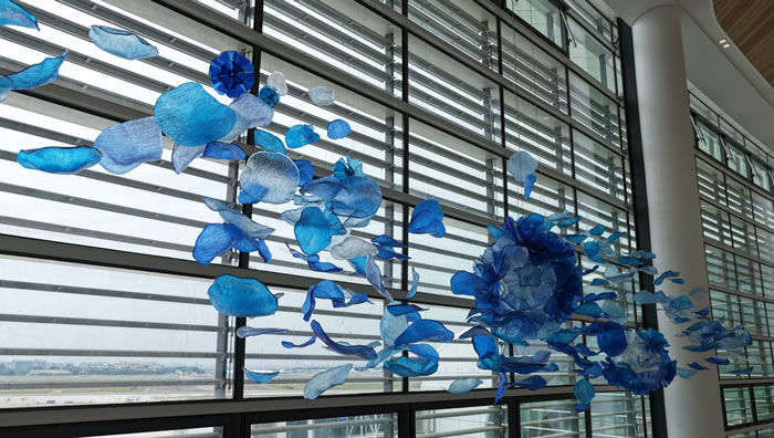 藝術家把整個嶺南的春天都掛在了天花板上:這些仿佛被南風吻過的藍色花瓣,藏著不少小心思——它們有著通花瓷般的玲瓏,又帶著麥稈畫的細膩,每一片都是非遺智慧與未來美學的混血兒。為了讓這場花雨真正“飄”起來,湖北美院藝術家團隊玩了個視覺魔術:用0.3毫米幾乎隱形的鋼絲繩,輕松吊起了整整3噸的裝置。最妙的還是花瓣的“變裝術”——特調的“嶺南天色藍”會隨著天光悄悄改變心情:清晨是暖金色問好,正午是天空藍微笑。表面那些精密的波浪紋理,更是在地上投下流動的光斑。這些會跳舞的花瓣告訴來往的旅人:機場的春天,從來不會落幕。