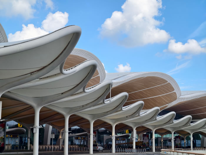 廣州白云國際機場 T3 航站樓以 “羊城花冠” 為設計意象,融入 “云山珠水”“花城” 等城市特色,與綜合交通中心實現空鐵無縫 “零換乘”。隨著 T3 與第五跑道啟用,白云機場成為國內首個五跑道航空樞紐,近期年旅客吞吐量達 1.2 億人次,成為粵港澳大灣區多元文化交融互鑒的重要樞紐,有力推動區域文化協同發展與創新傳承。