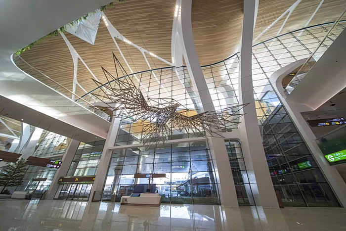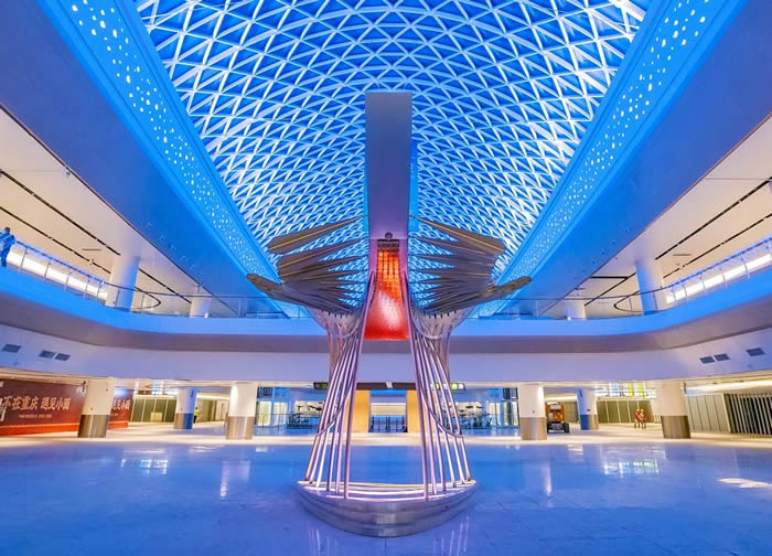 無論是出發還是抵達,都少不了一場溫馨的迎接。藝術家把廣東省鳥白鷴請到航站樓,與飛機航線之美夢幻聯動:一只身姿如嶺南山水般流暢寫意,一只輪廓似機場鋼結構般利落分明。這兩只數噸重的“大鳥”僅憑幾個隱藏受力點就實現懸浮魔法,鏡面羽翼實時倒映著航站樓的流動風景,智能光線還會隨著游客的腳步玩起變裝秀,科技感十足。