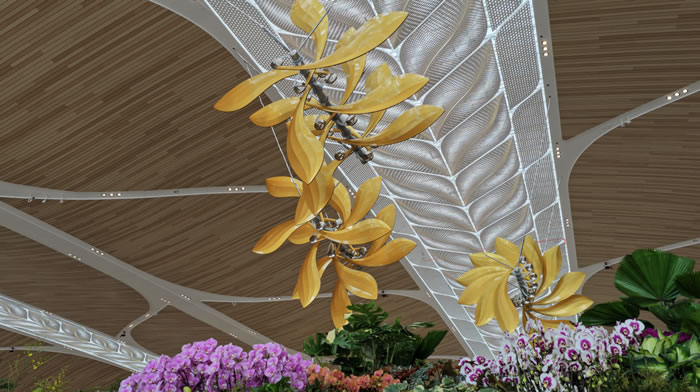 西安美院藝術家團隊從嶺南經典的滿洲窗中“借”來靈感的幾何線條,讓傳統花城的浪漫與飛機起降的現代節奏,在旋轉花瓣間美妙相遇。更神奇的是,這群花兒會“自己看天色”變裝:清晨披上暖金色,開啟明朗一天;正午換上天空藍,送來滿眼清爽。原來每朵花里都藏著精密的“智能大腦”,精密旋轉系統則帶來看得見的科技浪漫。