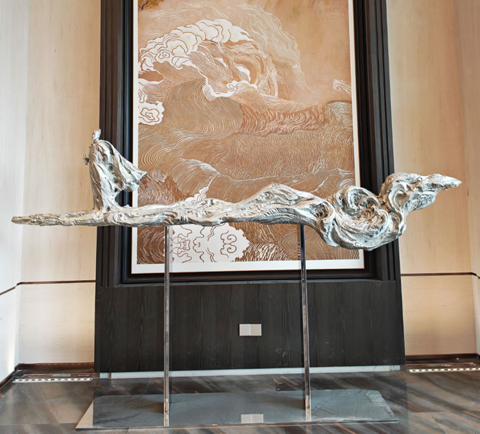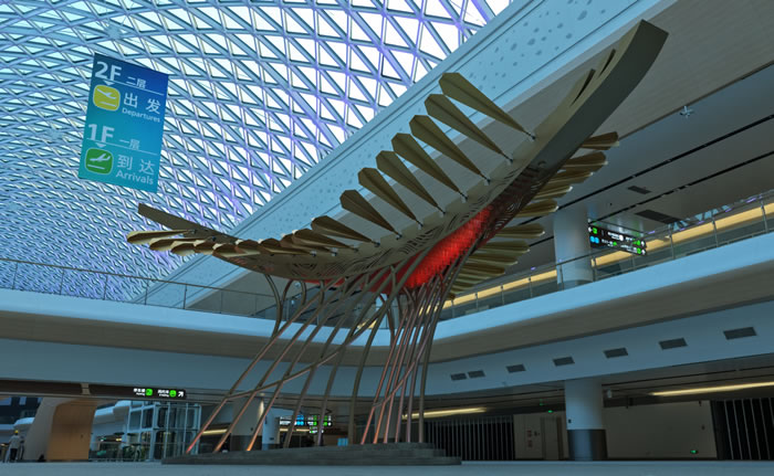 廣州白云機場 T3 航站樓的公共藝術體系,展現了空間美學理論與實踐相結合的探索性實踐。通過系統性的規劃,藝術介入空間,將航空樞紐轉化為承載文化傳播功能的復合場域。在創作實踐中,項目團隊邀請國際頂尖藝術家參與,運用現代藝術語言解構嶺南傳統文化符號,實現傳統藝術元素的創造性轉化與創新性發展;同時整合數字交互、虛擬現實等前沿技術,構建動態化、沉浸式的文化感知場景,使傳統文化資源獲得新的詮釋載體與傳播路徑。