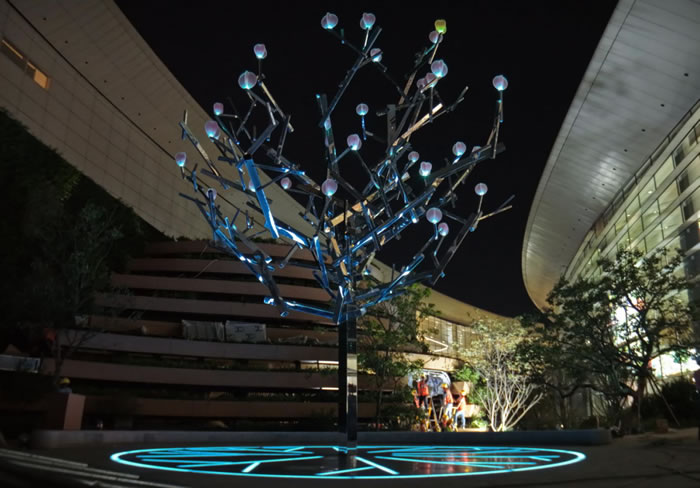 這件作品的的靈感取自嶺南白蠟樹的翅果,這些以每分鐘不到2圈悠然畫弧的金色精靈,正是藝術家標志性的詩意機械語言的完美呈現。曾兩度斬獲IF設計金獎、紅點至尊獎的尤西,最擅長讓冰冷科技煥發溫暖生命——這三組分別隱喻昨天、今天與明天的旋轉種子,在精密的傳動系統驅動下,竟以3.9噸的重量演繹出南國微風托舉般的輕盈。