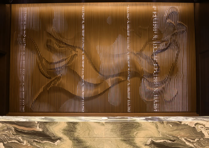 感受過光之宇宙的靜謐,再進入貴賓室小憩時,墻上有一面會“動”的魔法地圖——中央美院藝術家團隊把海上絲綢之路的輝煌歷史,“藏”進了一幅充滿嶺南韻味的青銅浮雕里。內藏的智能LED屏在代碼驅動下,會讓光芒如星圖般點亮,海浪開始流動,商船仿佛重新啟航。讓青銅的厚重質感與數字光影完美融合,毫無違和。靜態的浮雕與動態的光影,共同演繹了一場跨越千年的航海史詩。它不只講述歷史,更在向游客低語:廣州的故事,從一開始,就是一場與世界的溫暖握手。