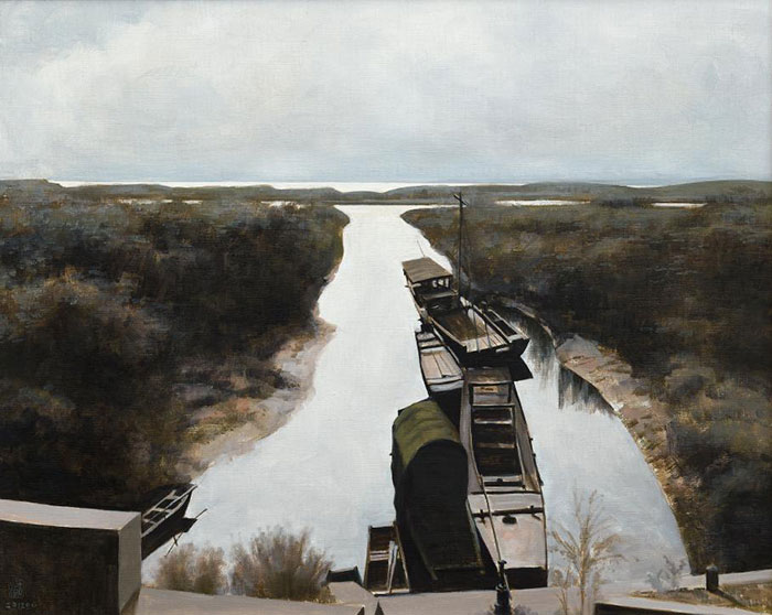 策展人尚輝在展覽前言中寫到,古棕并未刻意追求所謂油畫本土性特色,但當他 40 歲回到故里泰興,站立在運河邊岸時,卻對運河上遠行帆船的景色怦然心動。這固然夾雜著游子歸里的時光感慨,但運河千年不息而沉靜的流淌也讓他產生了與涅瓦河完全不同的審美感受。那一刻,他的油畫悄然發生了一種改變,他也更多地畫江南枕河而居的粉墻黛瓦、漓江倒映的碧巖舟影、西北戈壁荒灘上的寺院古塔。從《向遠方》(2002)到《無望蘆村》(2010)、《農忙時節》(2011),再至《龍江漁船》 (2013)、《塔什庫爾干的白云》(2013)等,他從自己的故里江南畫到中南和西北,他畫得很暢快,也很自由,筆觸的率性、色調的灰而透等, 都顯現了油畫高級色彩對中國風景的敘述。在這些作品里,他沒有故作“寫意”,卻隨處見寫意。其寫意大自然顯現了藝術家的率性而為, 但這種率性卻仍以油畫傳統的歷史審美經驗為基礎而發揮了油畫語言的藝術表現力?;蛘哒f,學院油畫的素質與修養讓他眼里的日常風景得以在藝術創造層面獲得升華。