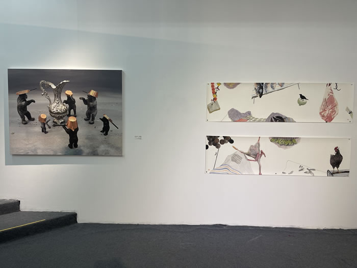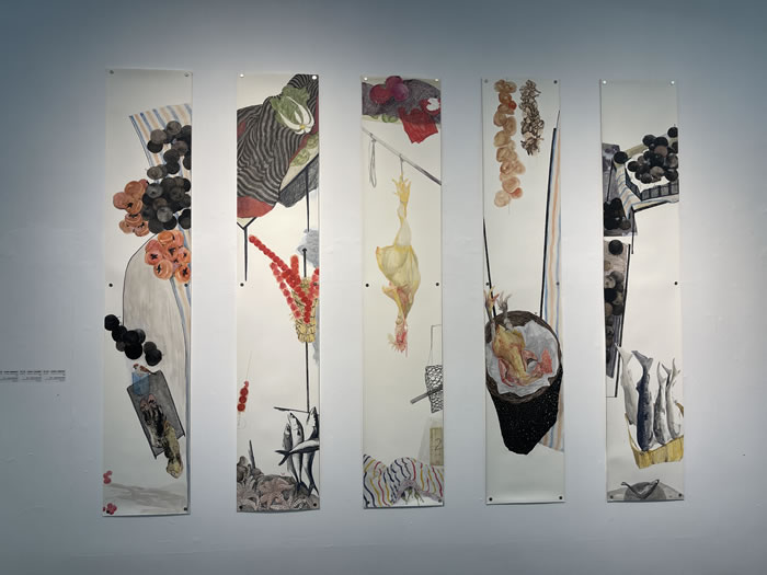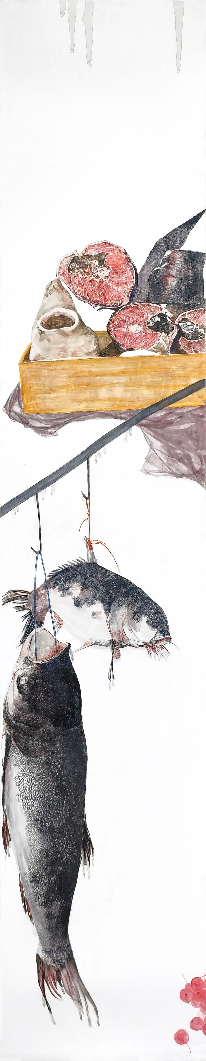 近十余年來,李文旻的作品都較傾向于關注動物及其與人在生活中的關系。尤其在澳洲生活多年又回到東北老家后,久違的回憶被再次喚醒,經過時空周轉后重新面對東北特色的早市,令李文旻更加敏感于煙火氣下嘈雜市井中故土獨有的生活畫面——而這里的動物,有和凍梨一起凍得“梆硬”的魚, 有拔了毛兒倒掛的公雞,有案板上的半截兒豬蹄......它們似乎生來便背負著“服務于人”的命運,在熱鬧的集市上冰冷和被肢解著,真實又那么理所應當。她的彩色素描將幽默與同情的人類特質賦予了每一幅動物場景。令觀者感覺與這些動物如此親近,熟悉它們的日常又或悲慘于其結局。