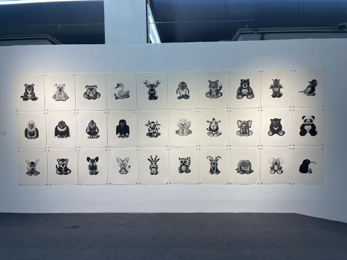 同樣與觀眾四目相視的是邁克爾·肯普森作品中的動物。它們外形可愛呆萌,如同卡通動漫中出現的形象,或是在商場兒童區最受小朋友喜愛的毛絨玩具?!皩游飩兯茉斐扇绱丝蓯鄣男螒B,源于我的個人經歷——你知道,我當爺爺了,因此在和孫子孫女一起成長的過程中,我也接納了他們眼中動物的模樣?!碑斎?,邁克爾的作品并非停留于此,當這些不同品種的動物排列在一起時,我們似乎會被它們那一雙雙又圓又大的眼睛“盯”到——大而圓的眼睛自然符合可愛的卡通感,但在它們直勾勾的目光中,我們似乎看到了一種更木訥或冷漠的“機械”意味。的確,邁克爾根據文化寓意的內涵用不同動物代表不同國家,通過作品中動物的象征性指涉人類國家之間的關系,它們外表看似整齊親人,但那無神的雙眼卻齊刷刷地暴露了“國家機器”的影子?!岸嬲鷦拥膭游飸撌腔铎`活現的,遵從自然法則以一種和諧的方式共存,這不僅是叢林的智慧,也應該是國家與國家之間的智慧?!彼囆g家本人說到。
