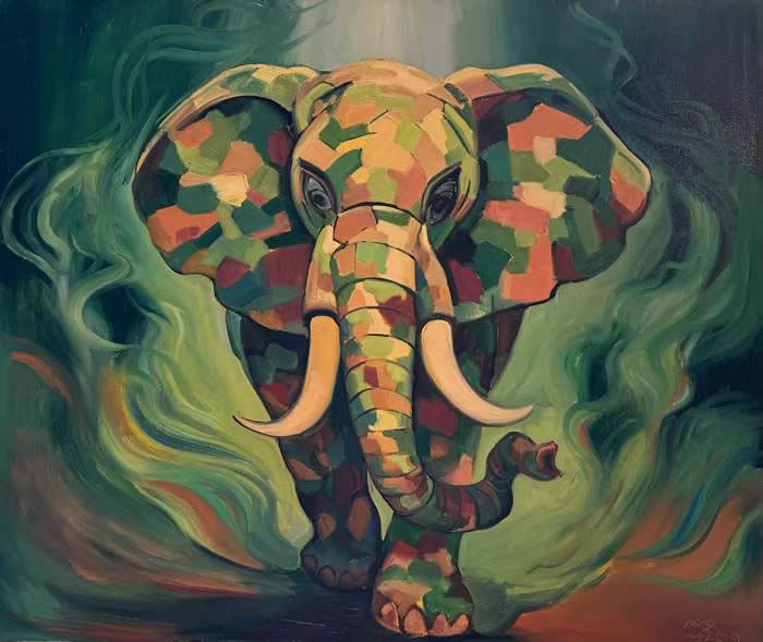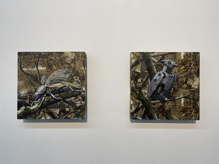 作為本次展覽的發起人,藝術家邢俊勤與伊恩·霍華德持續舉辦了25年的中澳聯展,每年都會選擇一個不同的主題,在挑戰自我創作的同時也從不同國家背景出發,共同探討人類與社會發展下的新議題。軍旅藝術家的身份下,邢俊勤描繪了各種“機械化的動物”,它們棲息在一片經過迷彩偽裝的叢林景觀中,而暗紅色的雙眼似乎暗示著對危險的警惕與潛在的危機。在邢俊勤看來,世界似乎正朝著一種新的“叢林秩序”方向發展,而在這一進程中,人類與動物之間的關系可能也面臨著新的挑戰。
