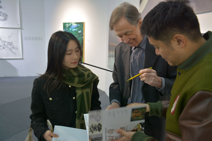 藝術家伊恩·霍華德(中)與蘭錦斌(右)為觀眾留言