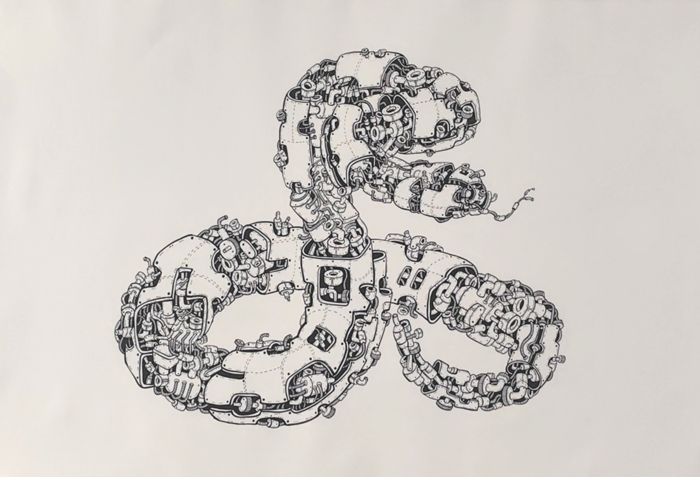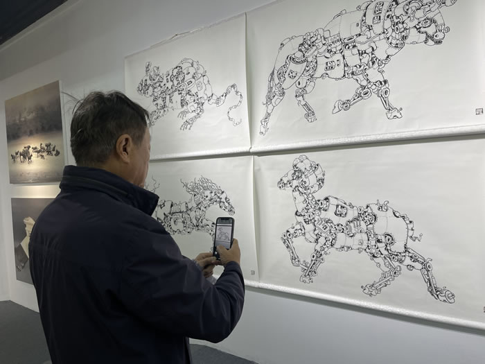藝術家蘭錦斌的水墨動物則以“機甲風”示人。當十二生肖和機甲相合成,當紙本水墨線條與理性冰冷的機械構件相結合,強烈的視覺和心理沖擊不言而喻。這些“合成的動物”是時代異化的產物:它們的身體由各種管道、電線和鉚接面板等零件構成,似乎足夠自信地展示了當前技術在嘗試模擬動物的生命形態上所取得的“成果”,然而面對后工業文明對自然的影響,科技當真能夠改變自然甚至物種?這樣的干預到底孰是孰非?當“合成的動物”作為一種科技異化的新物種(比如電子狗),它是否能夠承載傳統“十二生肖”的文化意蘊呢?