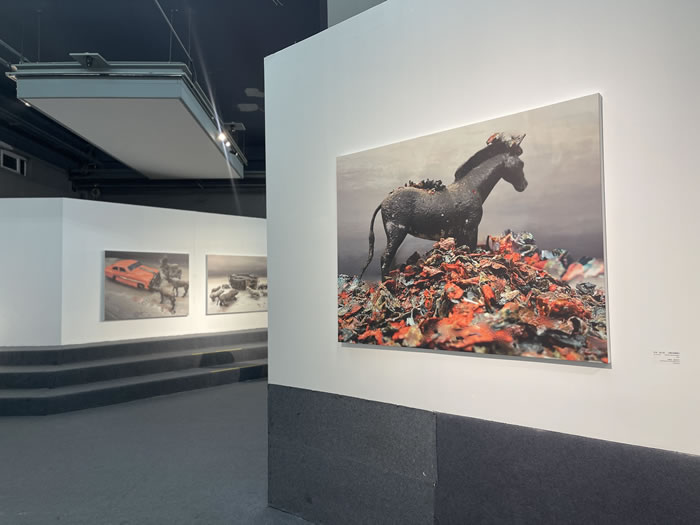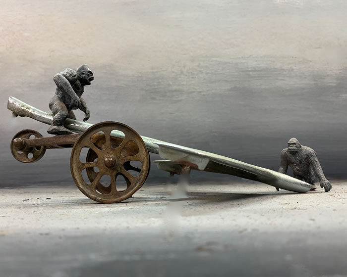 伊恩·霍華德呈現的一系列多媒體數碼打印作品正面回答了這個問題。藝術家將語境延展至人類滅絕之后——人類的末日并非世界的末日——因此,藝術家假設在人類和其文明消散之后,當動物成為地球上的幸存者,它們又將如何看待人類文明的遺存?霍華德在作品中精心布景,通過鏡頭將微縮景觀放大,在特寫和對焦的調試處理中,作品最終呈現出既真實又虛幻的感受。在《哀悼過去》中,一群犀牛和河馬圍著一輛側翻的轎車,或抵著頭仔細嗅著它遺存的味道,或徘徊觀望,而遠處的地平線被虛化,在整體混沌的畫面里,這群動物似乎正在為人類文明的遺存“默哀”。在《拾到現成品》里,猴子圍繞著炮彈遺骸,甚至騎在上面正視著觀眾,這樣的“現成品”當然令人唏噓,而在與之正視的過程中,又會察覺一絲諷刺與戲謔。