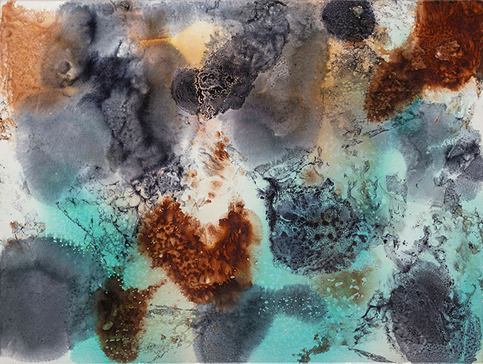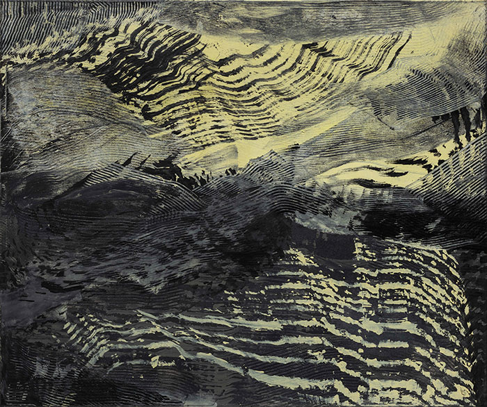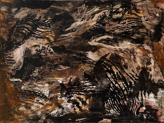在劉商英看來,趙東誠雖生長于江南,卻走出江南,走到了遙遠的西北,又將他對西北的體驗重新帶回到江南的情境中。其畫作并非單純形式語言的探索,而是“先有體驗,后埋入內心,再吐納”的過程。在行走的過程中,趙東誠也一直在回望傳統,回到他曾經潛心研習的黃賓虹的水墨世界,體悟古人如何在行走中感知內心與自然的關聯?!八M宰约旱姆绞接^照萬象,既寄情傳統山水,也深入更原始、更荒蠻的自然深處。西北大地與江南水鄉相距甚遠,巨大的反差似乎喚醒了東誠原本狂野的心,原始沖動涌現在作品中,引領他進入自由冒險的世界。在那里,直覺想象力讓畫面充滿視覺意象,他在似與不似、感性與理性間游走,找到了內心的通道?!?/p>