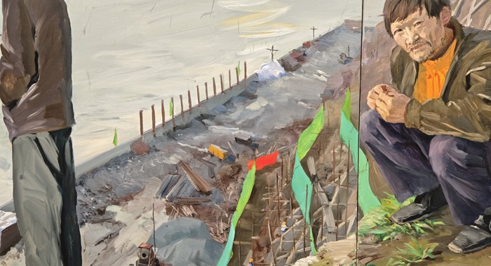 在《三峽新移民》中他借鑒了李公麟《海匯圖》的V形構圖,大面積留白,視野開闊,描繪了蓄水后煙波浩淼的三峽工地,主角是曾在此生活的普通人,包括玩耍的孩子,有些人好奇地看向觀眾,似乎對這個超級工程渾然不知。劉小東把他們從生活的環境中抽離,放進場景中。他在創作時也會參考照片素材,因此會發現人物會有一種與畫面的“縫隙”和跳脫感,半空中突然出現一只野鴨,這恰恰是劉小東想要展現的超現實一面,使他所描繪的現實更加多維度地展開。